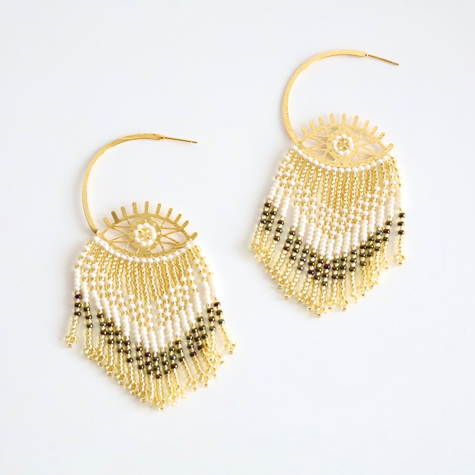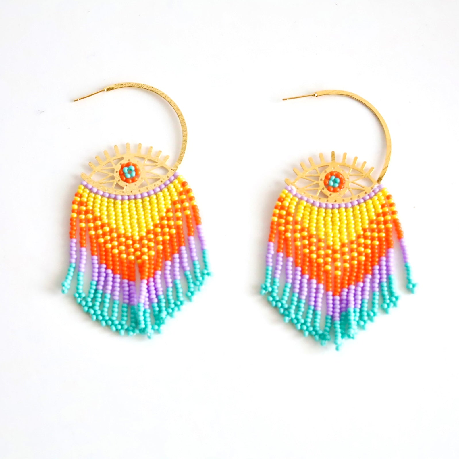 Featuring our carefully curated hand-embroidered hoop, uniquely designed with 24k gold plating and a variety of high-quality beads. The Fringed Eye Hoops are made from hypoallergenic and lightweight materials to ensure comfort and durability. With a group of Colombian artisans working hands on each pair of hoops takes about 2-8 hours to create depending on designs and detailing. A hoop is a must-have in a women’s closet, choose your favorite color today!