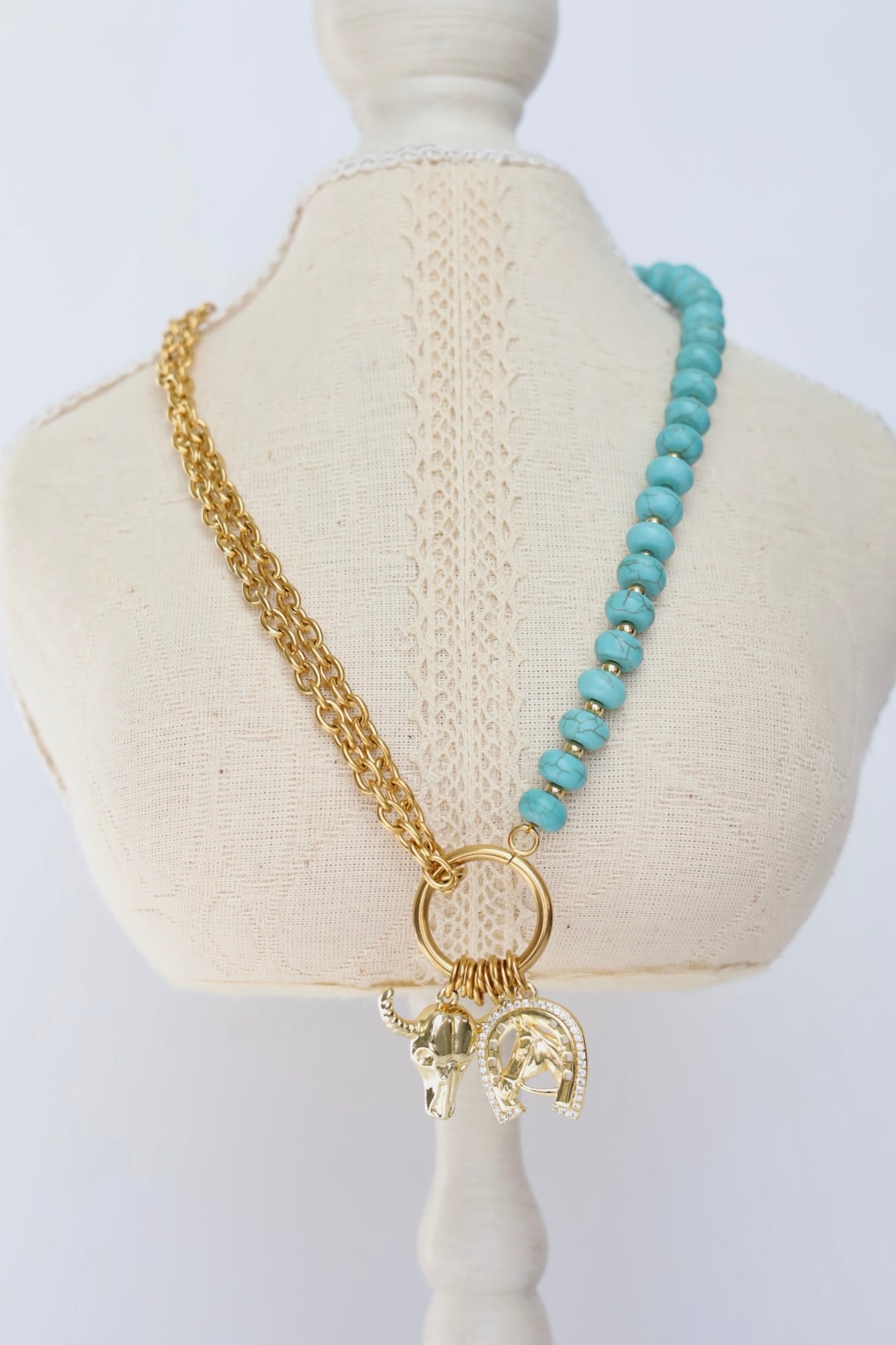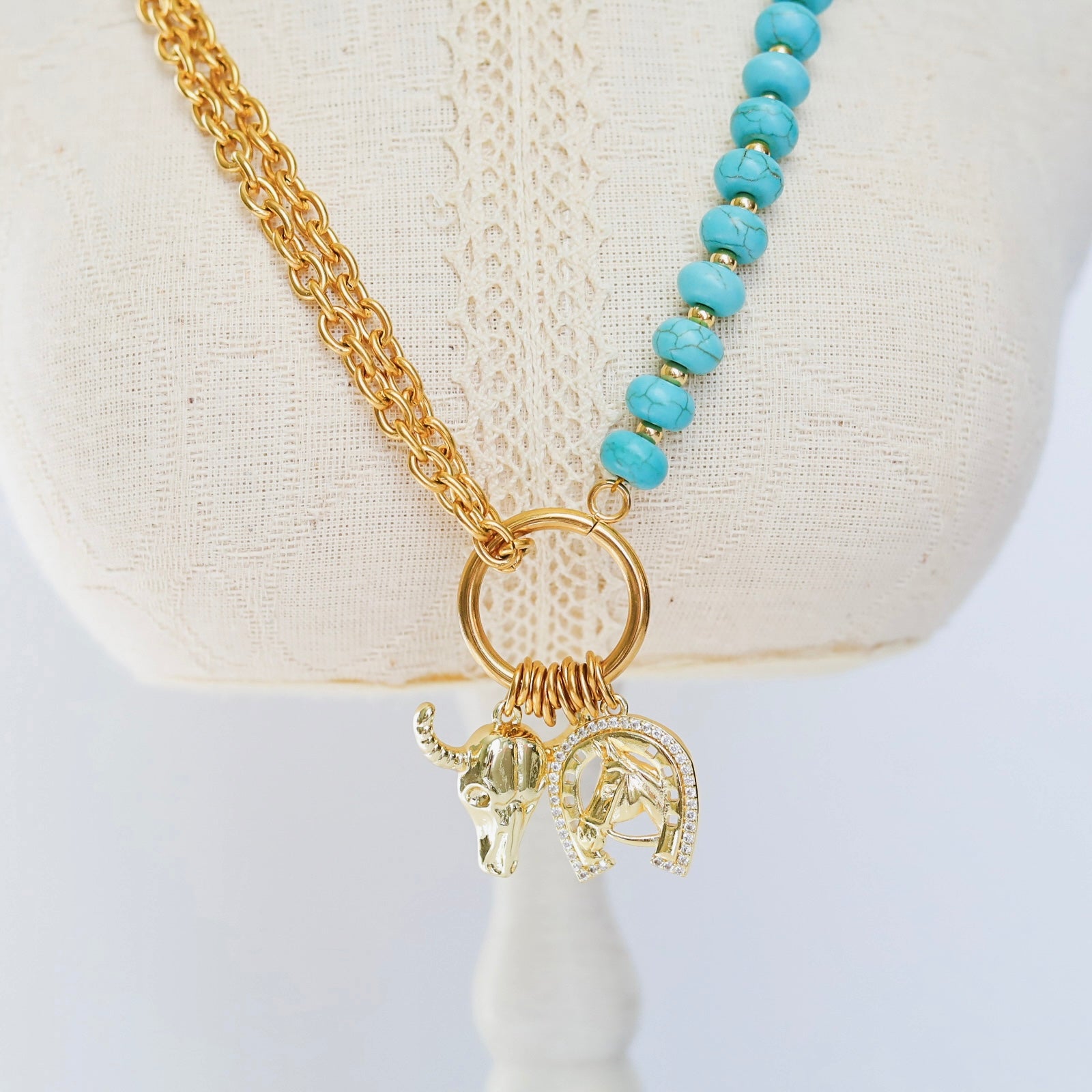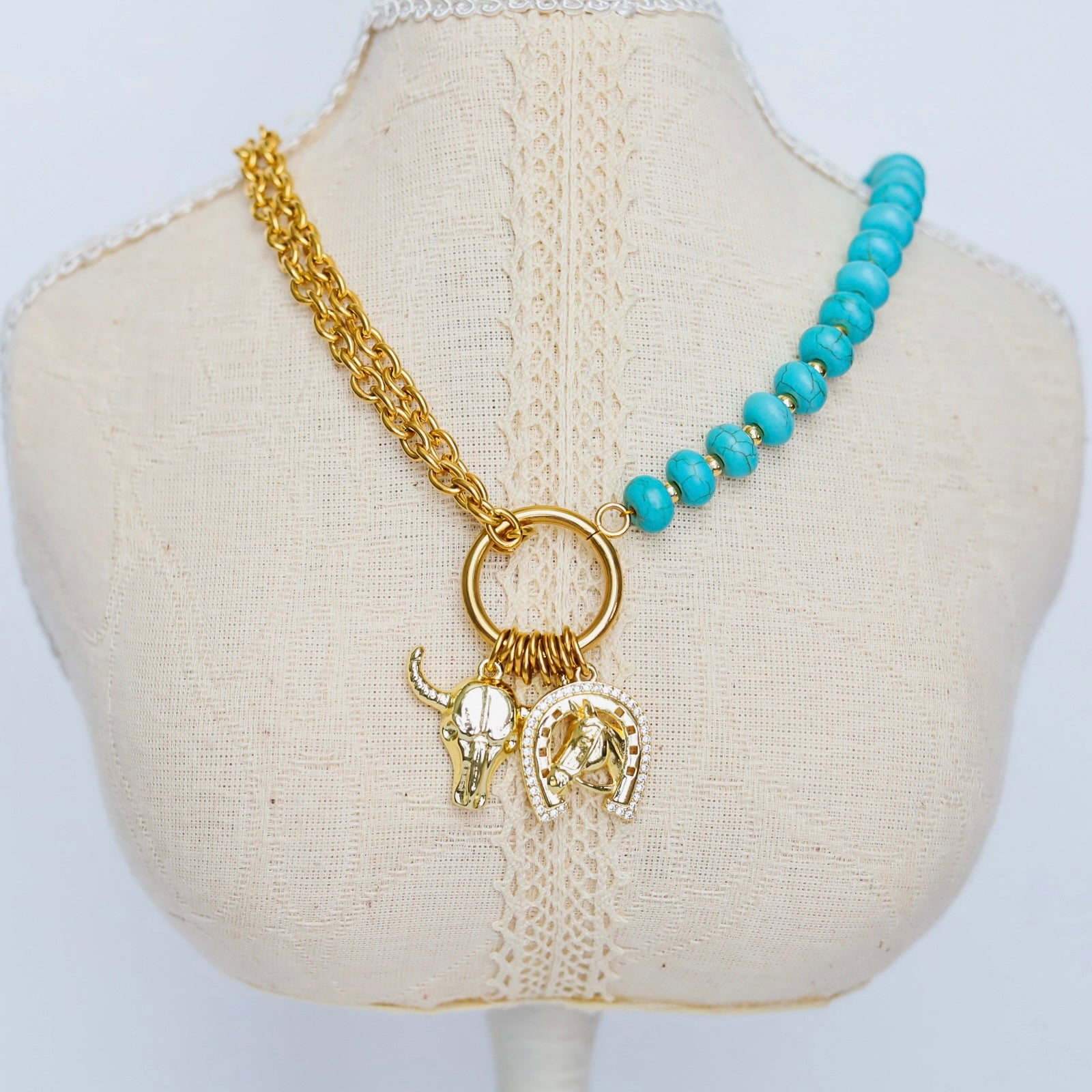 Bold, timeless, and inspired by the spirit of the rodeo, this statement necklace blends western heritage with modern luxury. Crafted with 24k gold-plated chains and accents, it features vibrant turquoise stones that bring warmth, strength, and a touch of Southwestern soul to every look.