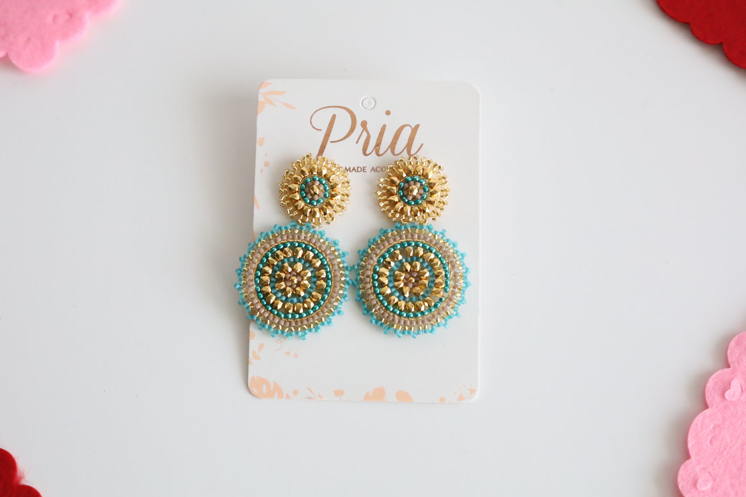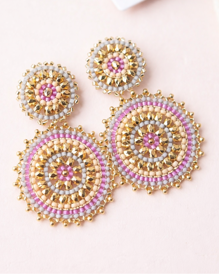 These statement earrings are hand-beaded by skilled artisans, with each pair thoughtfully crafted through hours of detailed beadwork. Designed using premium quality glass beads, they showcase intricate patterns, vibrant dimension, and exceptional craftsmanship.