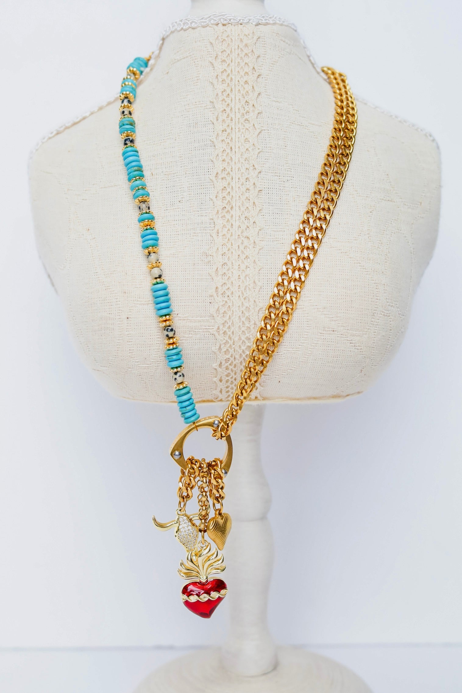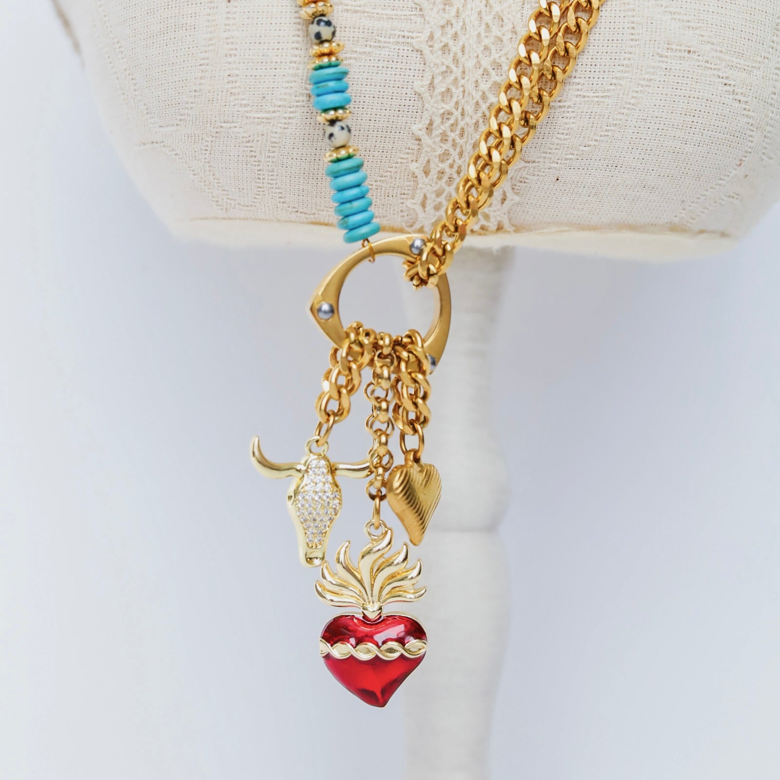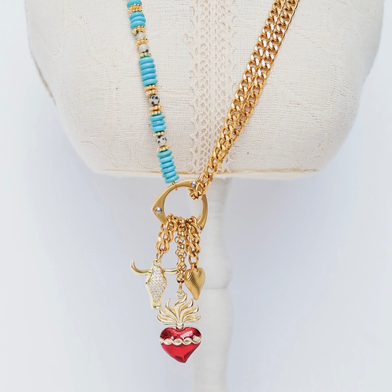 Bold, timeless, and inspired by the spirit of the rodeo, this statement necklace blends western heritage with modern luxury. Crafted with 24k gold-plated chains and accents, it features vibrant turquoise stones that bring warmth, strength, and a touch of Southwestern soul to every look.
